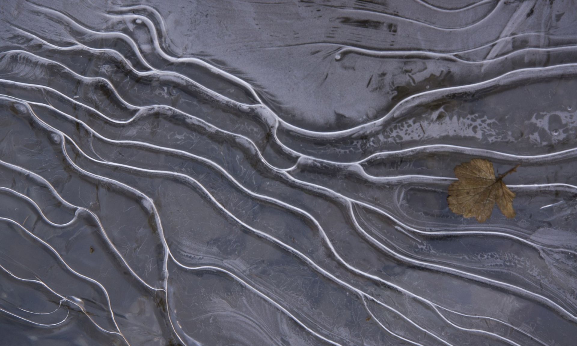 Winter - Ice formation with fallen leaf on the ground